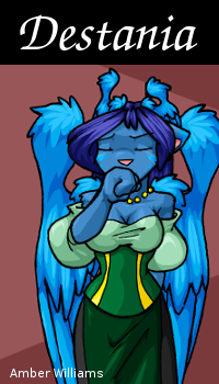 Destania was born 7026 years before the current main strip timeframe, or approximately 6600 before Abel's Story. At around 25, she was sent to attend SAIA, the Succubus and Incubus Academy run by Fa'Lina. However unwilling she was to begin with, she eventually became professor and ran the Pain and Terror department where she taught most of the older 'cubi characters who have appeared in the strip. She was especially friendly with Aaryanna and it was believed she was grooming Aary to take her position when she retired.